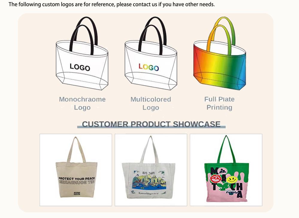 We offer custom logo printing for our reusable canvas tote bags. Whether you need a simple logo or full-color design, we can bring your vision to life. Perfect for promotional giveaways, retail stores, or corporate gifts. Bulk orders available with competitive pricing.